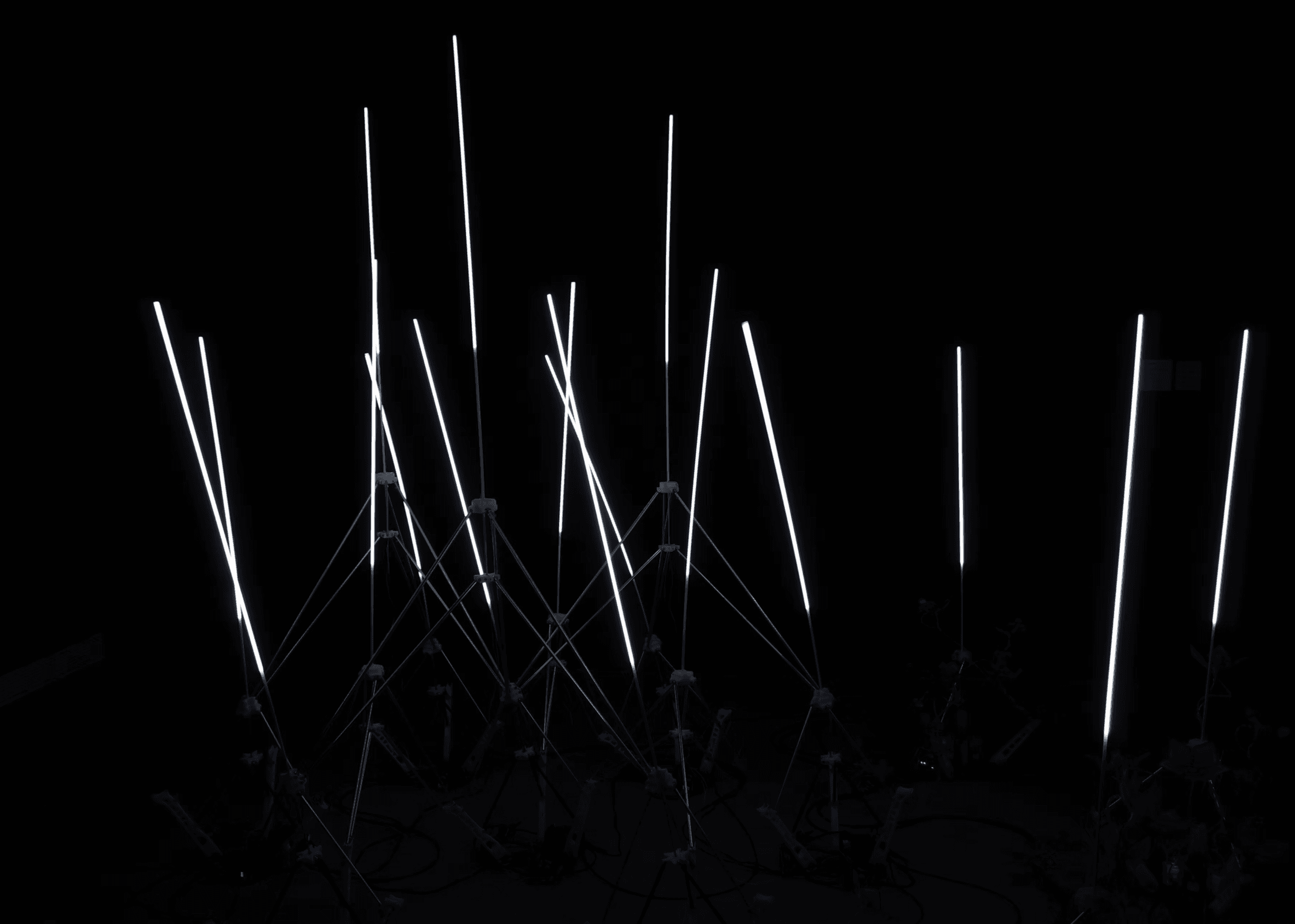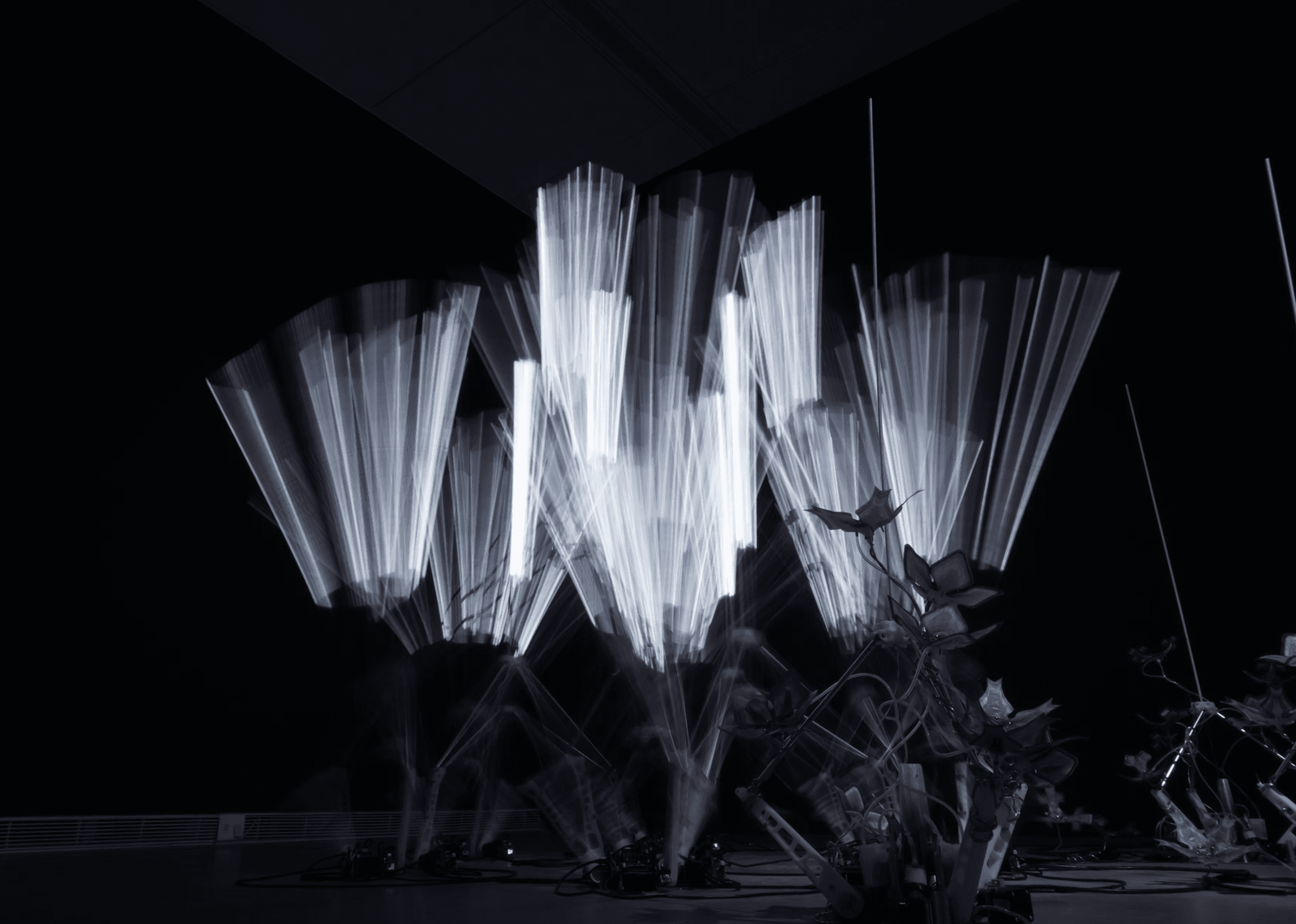 This artwork is inspired by the fundamental composition and growth structure of natural organisms. Its purpose is to use human-made technology as a unit of biological growth and activity mechanisms, demonstrating collective behavior and representing the uncertainty and biological form of both inorganic nature and organic behavior. The piece seeks to create new species in an extraterrestrial environment, composed of two distinct mechanisms: one-half mechanical organization and the other half soft inflatable tissue. The predatory tentacles, reminiscent of coral, are presented through mechanical linkages, while the organic movement of the leaf blades opening and closing is conveyed with the soft skin of the inflatable organs and airways. Various sensors capture environmental information to create biomimetic collective interaction, with the ultimate goal of generating interactive extraterrestrial environments.