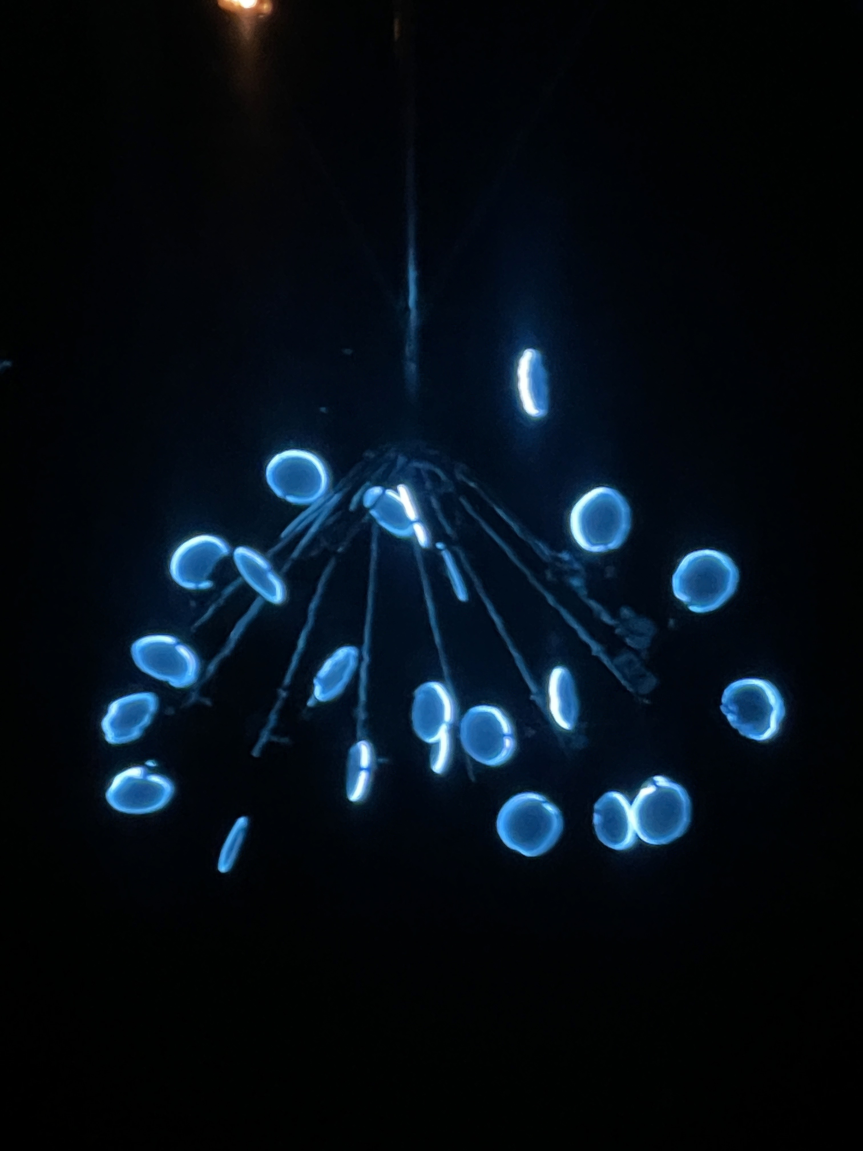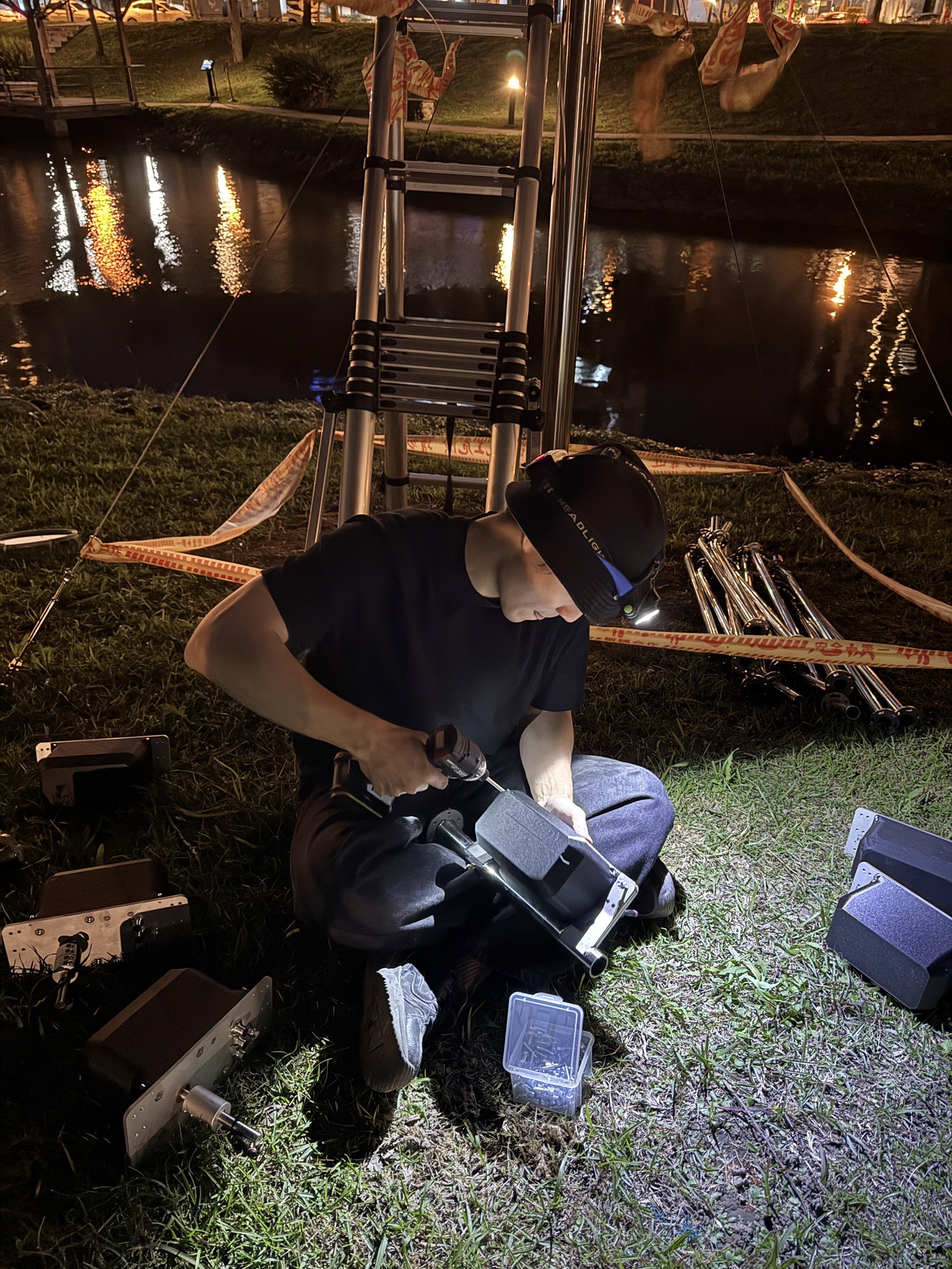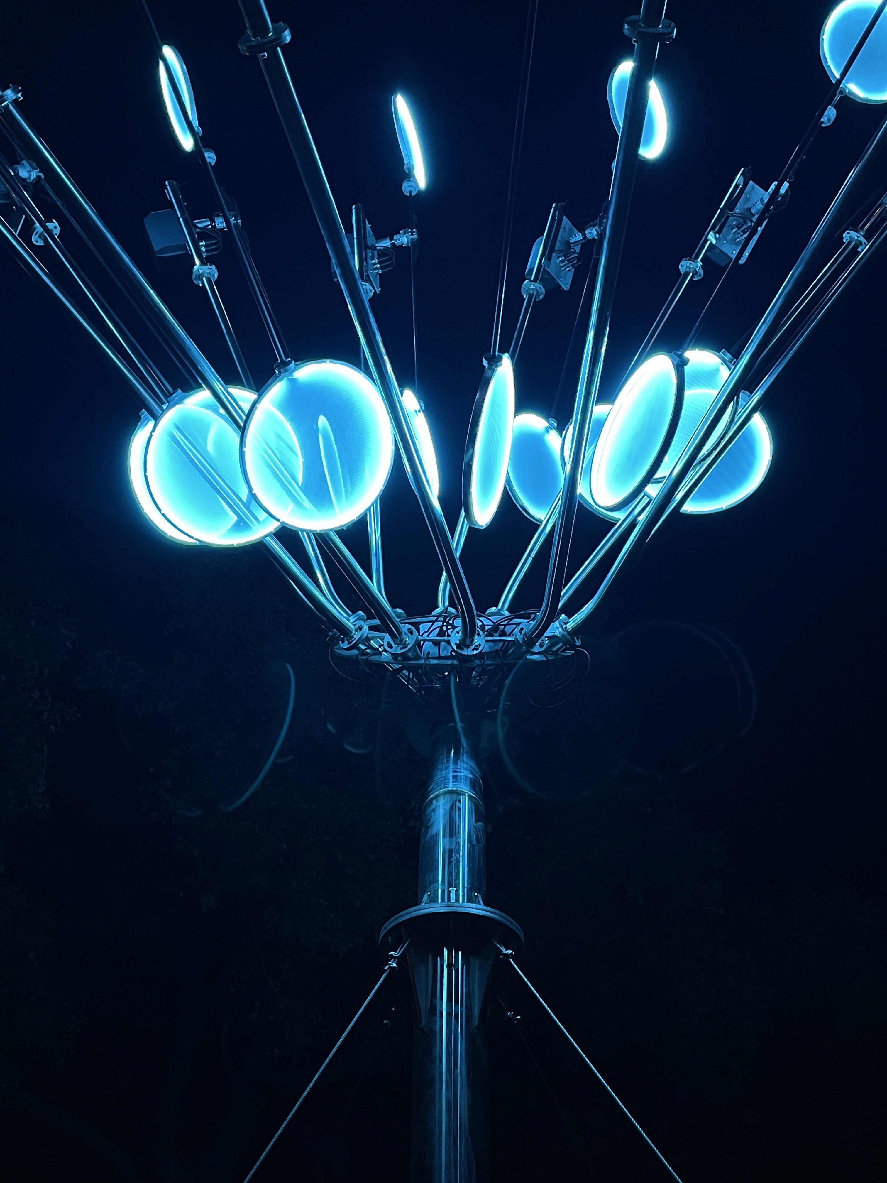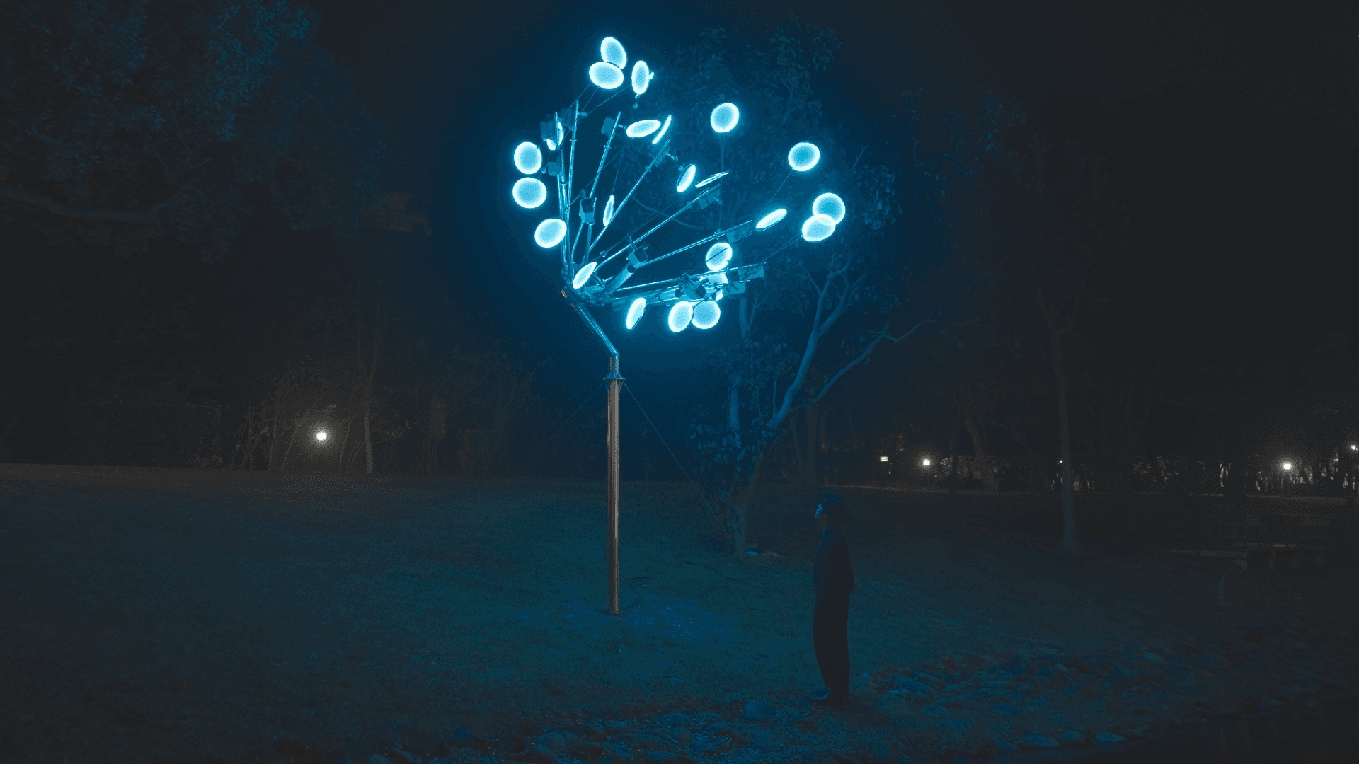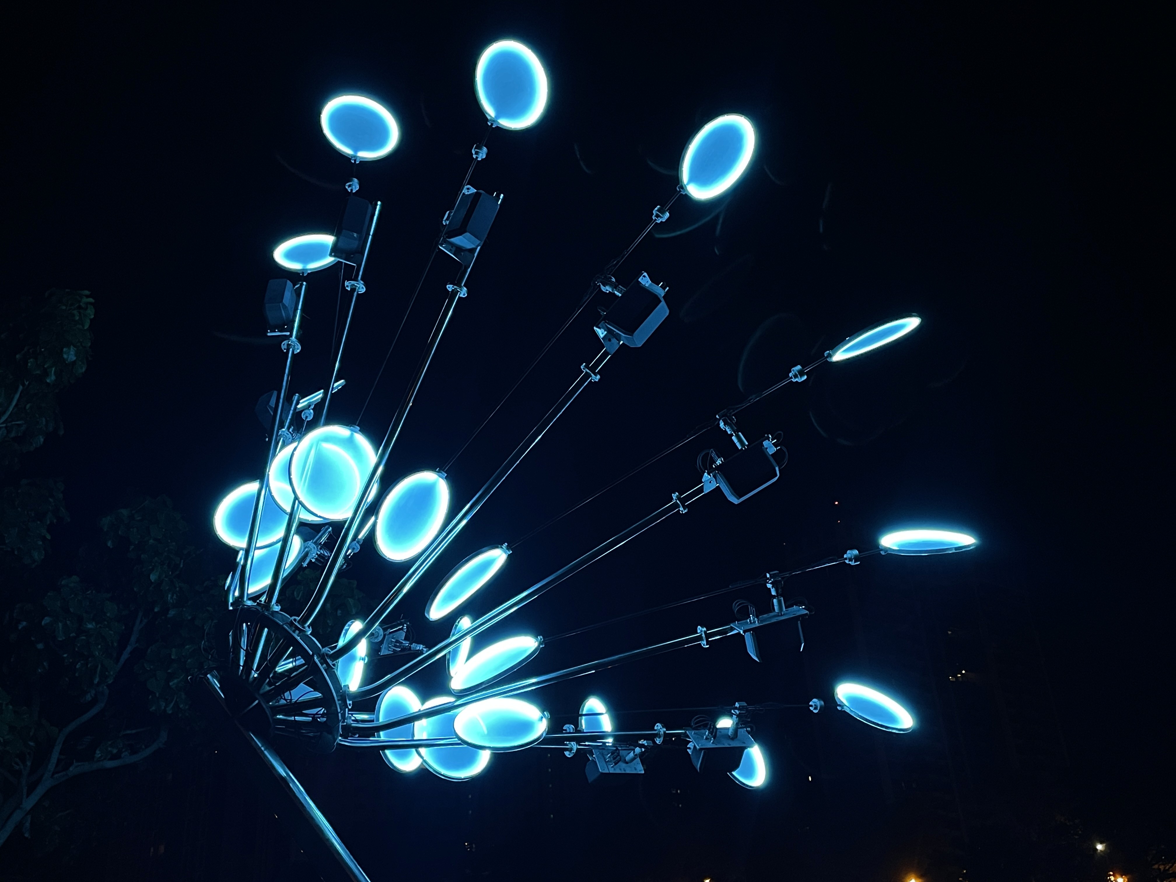 作品以一朵正在盛開的花作為造型隱喻。裝置由多組放射狀延伸的機械結構構成,每一個發光單元如同花瓣般獨立運作,透過程式控制與動力系統,在夜間緩慢擺動、旋轉。 光不再只是照明,而是成為聲音的可視化軌跡。這些光環在運動中留下微弱的殘影,使時間被拉伸、被觀看,彷彿聲音在空間中綻放。 作品選擇設置於水岸邊緣,讓機械生成的節奏與自然環境的黑暗、倒影與風交織。在人工與自然之間,《綻放的聲音》試圖喚醒物件本身的聲響潛能,使聲音如花一般,在場域中悄然盛開。