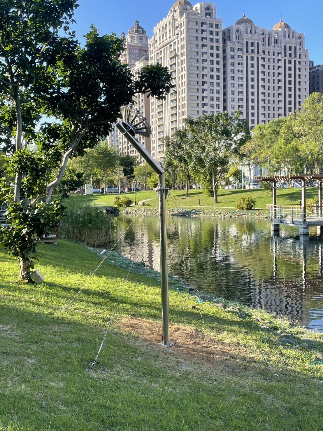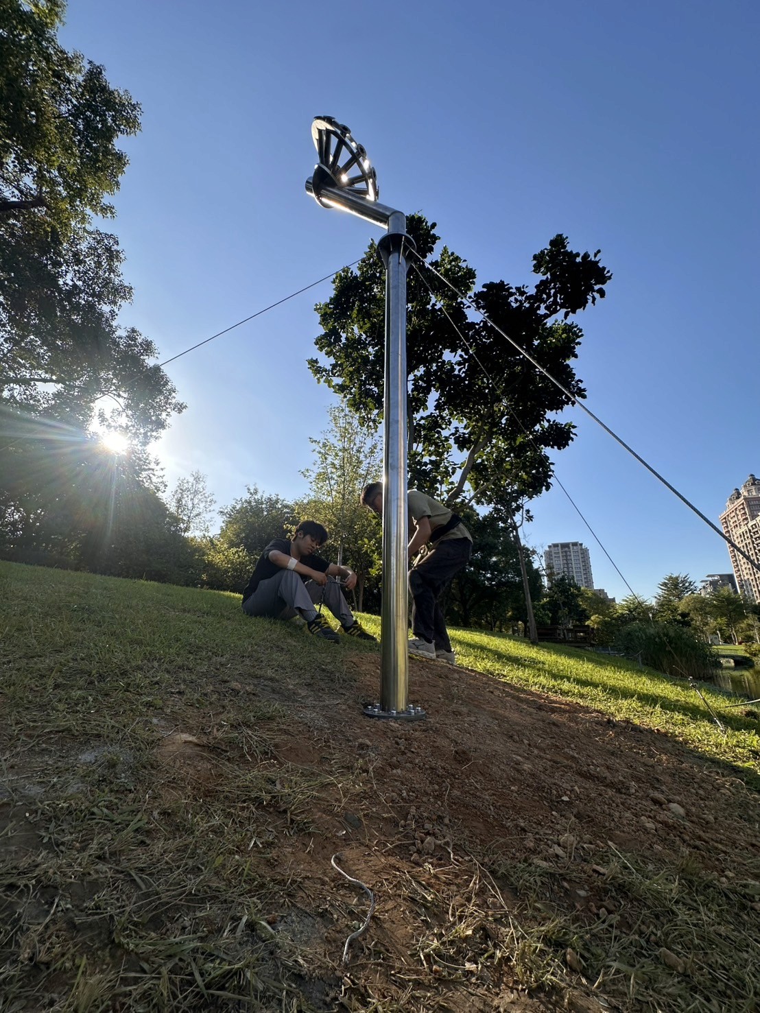 The Sound Blossoms is a kinetic sound sculpture that merges mechanical movement with material resonance. At its core, the work is driven by a pre-composed musical score, translated through a resonance control system that activates metal sound tubes at specific frequencies. Rather than relying on loudspeakers, the sounds are physically generated through the vibration of material itself — allowing the objects to “speak” through their own inherent acoustic properties. Each tone emerges from real-world resonance, not digital playback. The resulting sound waves unfold organically within the surrounding environment, sustained and shaped through the subtle integration of programming and mechanical motion. The work seeks to awaken the latent voice of matter. Along the riverside, these resonant frequencies gather and unfold — like a flower blooming in sound.