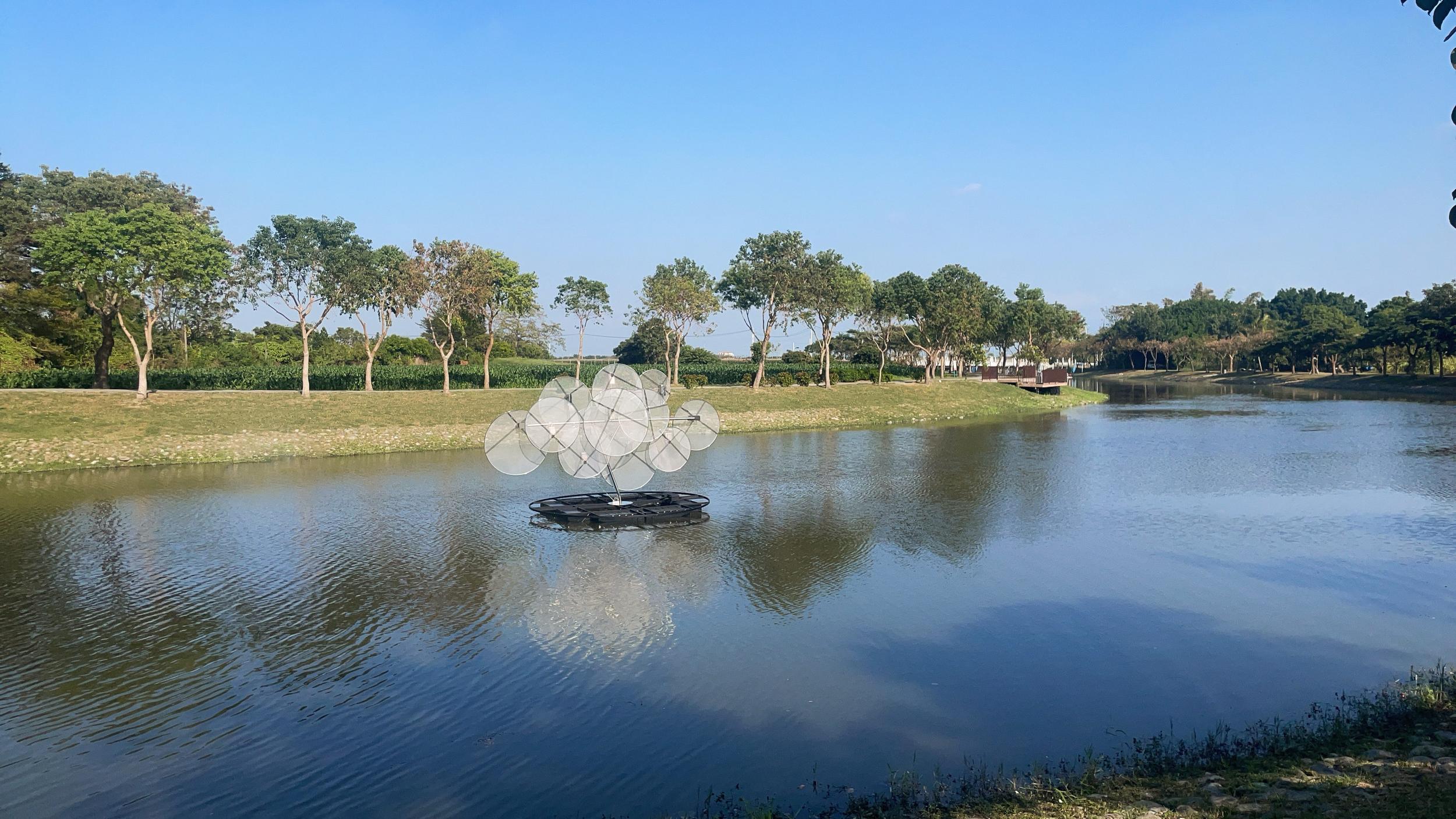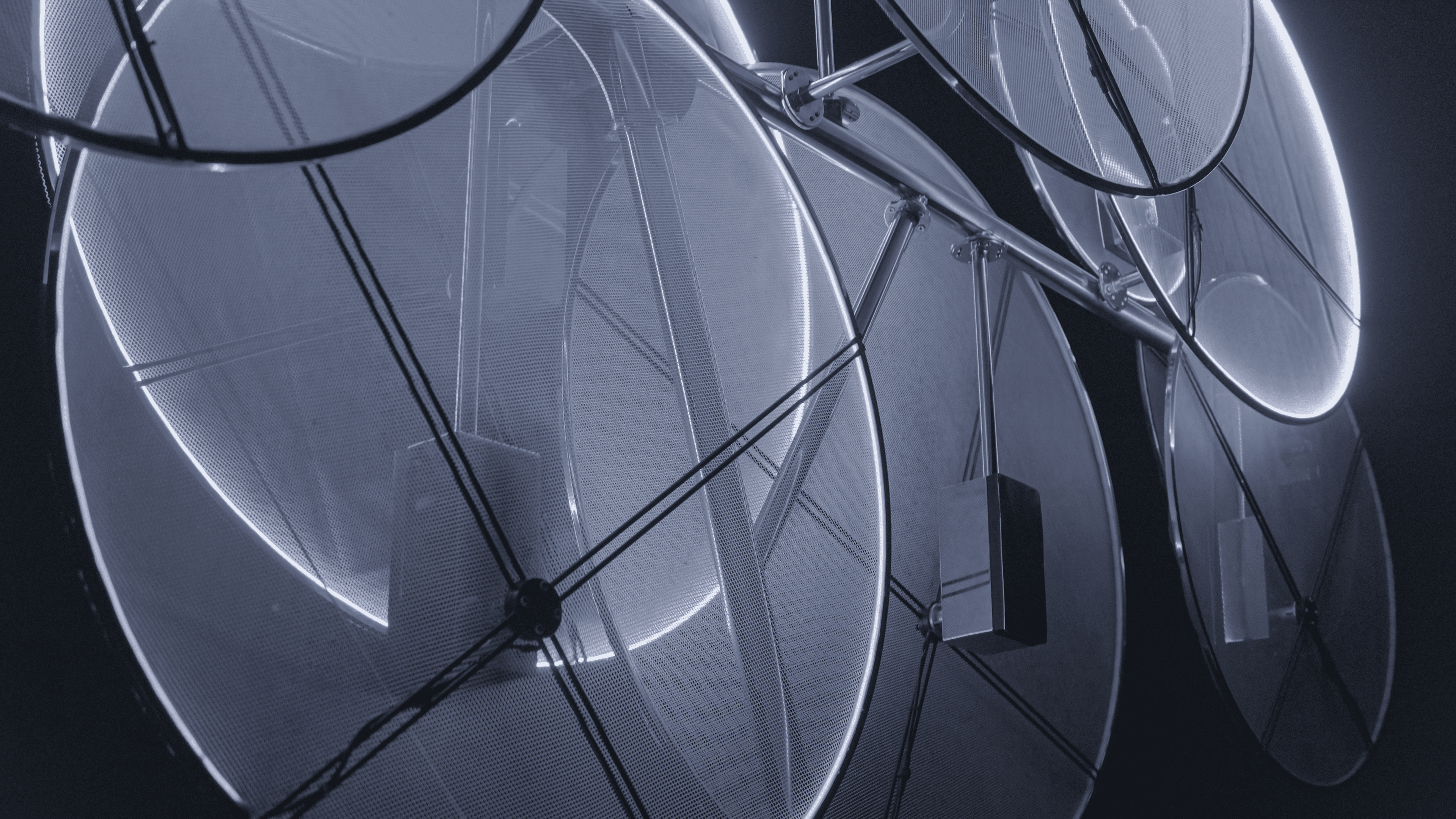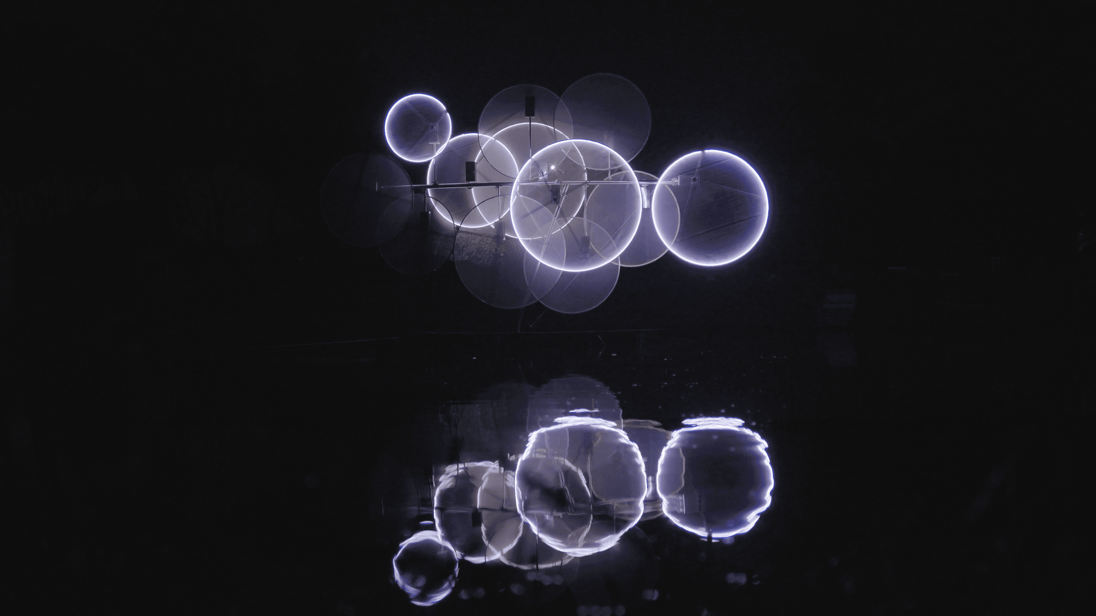 一件以動態系統與光影干涉為核心的裝置作品。作品透過多組圓形結構的低頻運動與相位差設定,使各單元在同一空間中形成彼此獨立卻相互干涉的動態場域。當光源沿著圓環邊界流動,結構之間的重疊、錯位與反射產生持續變化的視覺殘留。這些變化並不指向敘事,而是在參數控制下展開,使整體狀態介於靜止與行為之間。作品關注的是:當非同步運動與微小頻率偏移在空間中共存時,人類是否會主動賦予其意圖與情緒?在缺乏語言與聲音的條件下,動態系統是否能被感知為正在「交流」?所謂「呢喃」,並非來自聲音,而是觀者在面對低強度動態干涉時所產生的擬人化解讀。作品藉由最小限度的運動與光影變化,測試感知如何在無語言條件下生成情緒與關係。